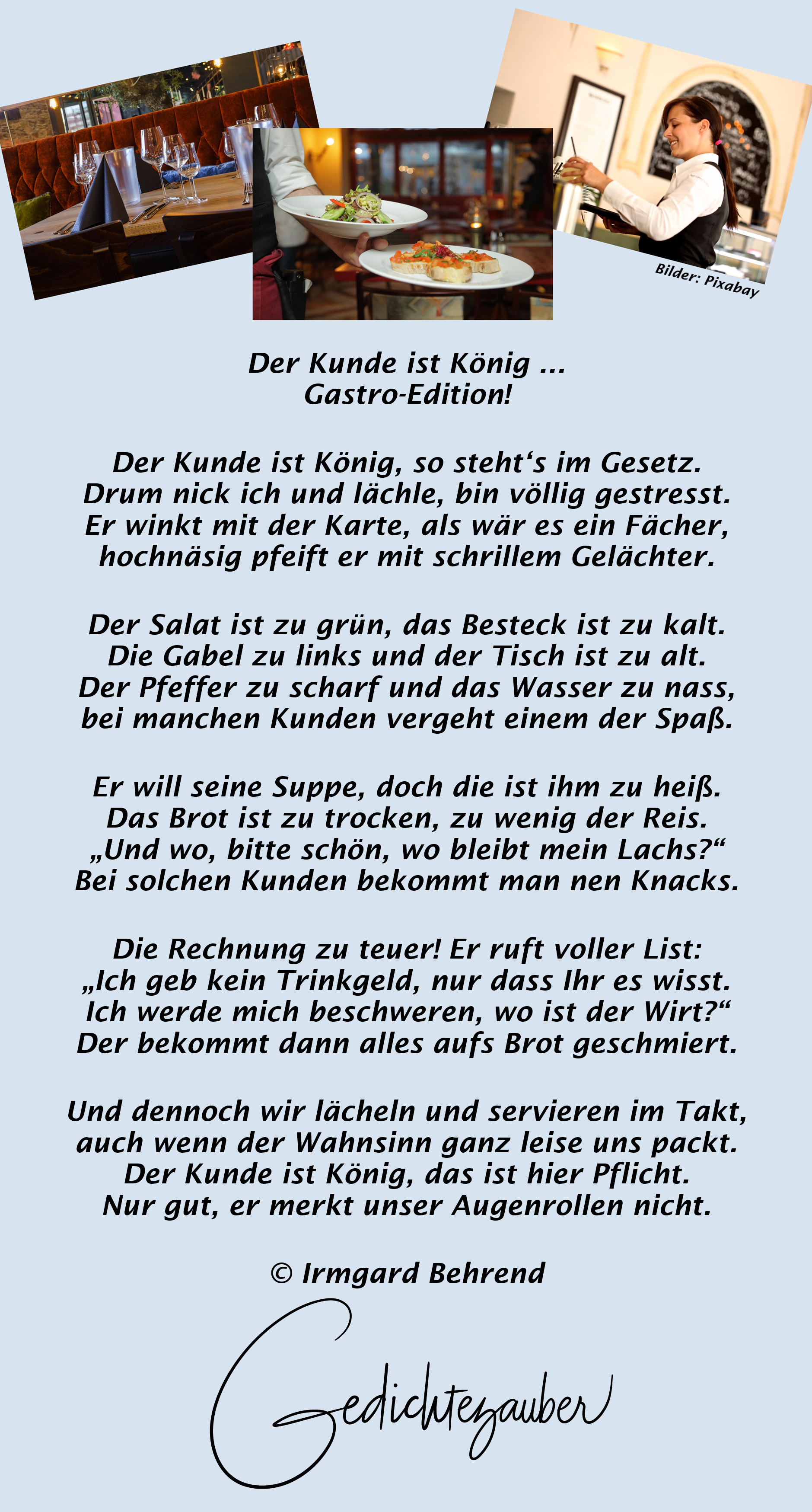 Und dennoch wir lächeln und servieren im Takt,